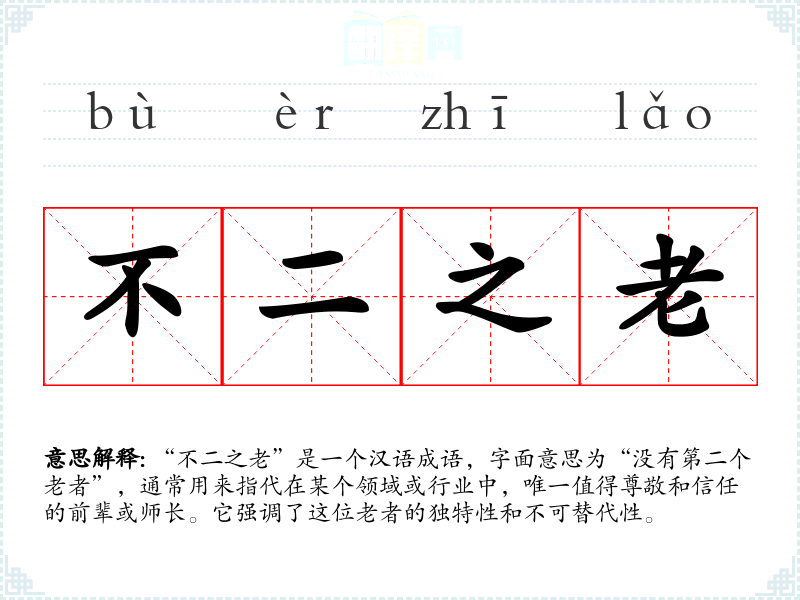 “不二之老”是一个汉语成语,字面意思为“没有第二个老者”,通常用来指代在某个领域或行业中,唯一值得尊敬和信任的前辈或师长。它强调了这位老者的独特性和不可替代性。