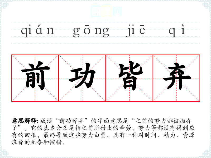 成语“前功皆弃”的字面意思是“之前的努力都被抛弃了”。它的基本含义是指之前所付出的辛劳、努力等都没有得到应有的回报,最终导致这些努力白费,具有一种对时间、精力、资源浪费的无奈和惋惜。