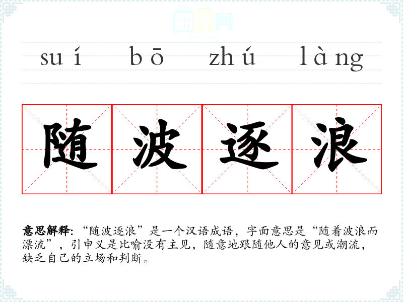 “随波逐浪”是一个汉语成语,字面意思是“随着波浪而漂流”,引申义是比喻没有主见,随意地跟随他人的意见或潮流,缺乏自己的立场和判断。