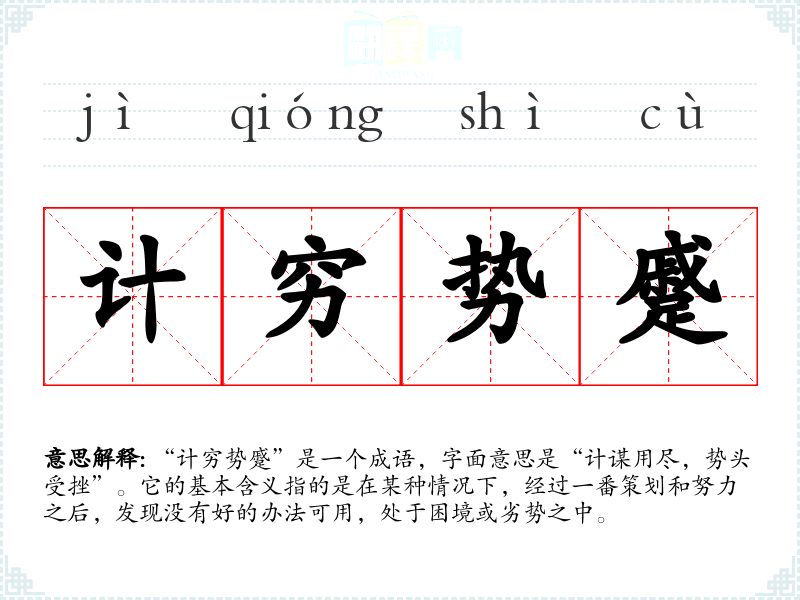 “计穷势蹙”是一个成语,字面意思是“计谋用尽,势头受挫”。它的基本含义指的是在某种情况下,经过一番策划和努力之后,发现没有好的办法可用,处于困境或劣势之中。