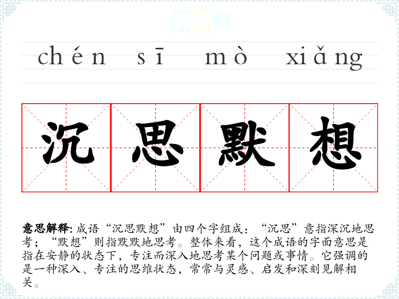 成语“沉思默想”由四个字组成:“沉思”意指深沉地思考;“默想”则指默默地思考。整体来看,这个成语的字面意思是指在安静的状态下,专注而深入地思考某个问题或事情。它强调的是一种深入、专注的思维状态,常常与灵感、启发和深刻见解相关。
