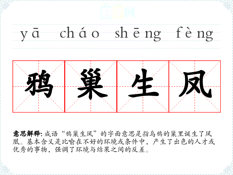 在**传统文化中,凤凰象征着高贵和优秀的品质,而乌鸦则与低贱、平凡相关。因此,“鸦巢生凤”不仅仅是一种描述,更是对人们潜能的信任。现代社会中,这一成语适用于许多追求成功的年轻人,激励他们努力拼搏,突破自我限制。