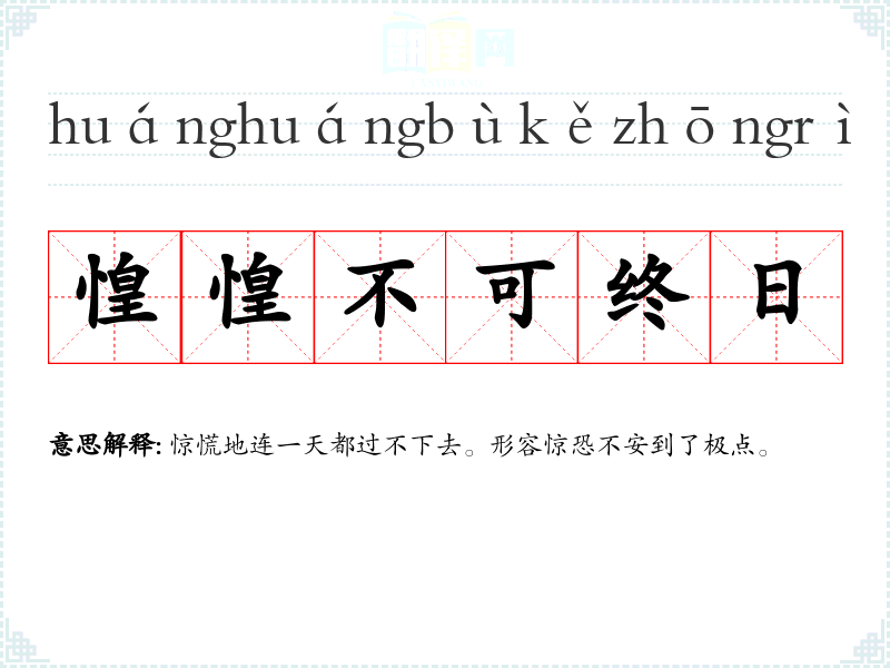 | 惶惶不可终日 | 惊慌地连一天都过不下去。形容惊恐不安到了极点。 |