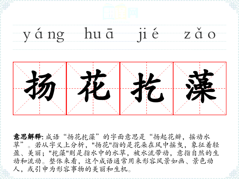 成语“扬花扢藻”的字面意思是“扬起花瓣,摇动水草”。若从字义上分析,"扬花"指的是花朵在风中摇曳,象征着轻盈、美丽;"扢藻"则是指水中的水草,被水流带动,意指自然的生动和流动。整体来看,这个成语通常用来形容风景如画、景色动人,或引申为形容事物的美丽和生机。
