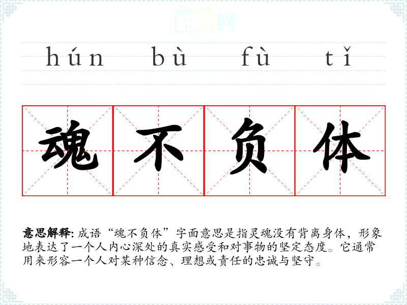 成语“魂不负体”字面意思是指灵魂没有背离身体,形象地表达了一个人内心深处的真实感受和对事物的坚定态度。它通常用来形容一个人对某种信念、理想或责任的忠诚与坚守。