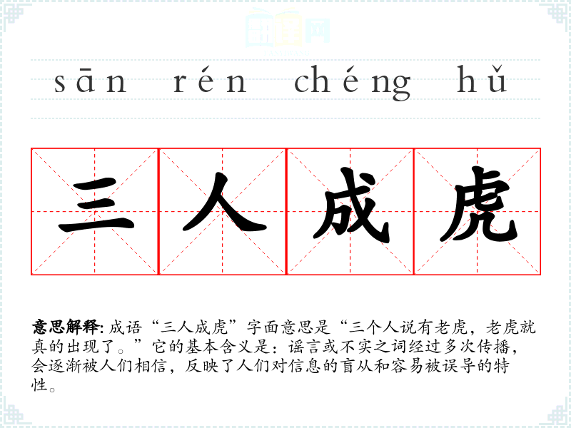 成语“三人成虎”字面意思是“三个人说有,就真的出现了。”它的基本含义是:谣言或不实之词经过多次传播,会逐渐被人们相信,反映了人们对信息的盲从和容易被误导的特性。