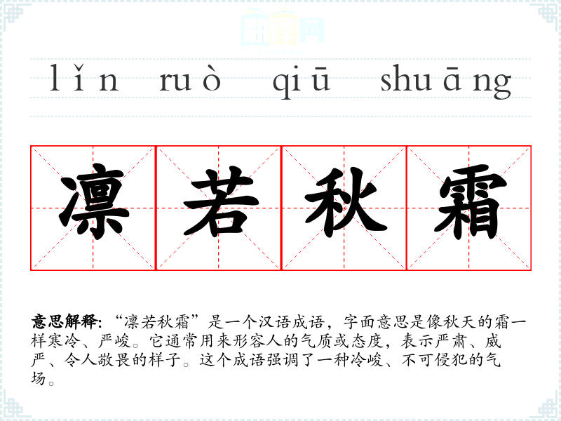 “凛若秋霜”是一个汉语成语,字面意思是像秋天的霜一样寒冷、严峻。它通常用来形容人的气质或态度,表示严肃、威严、令人敬畏的样子。这个成语强调了一种冷峻、不可侵犯的气场。