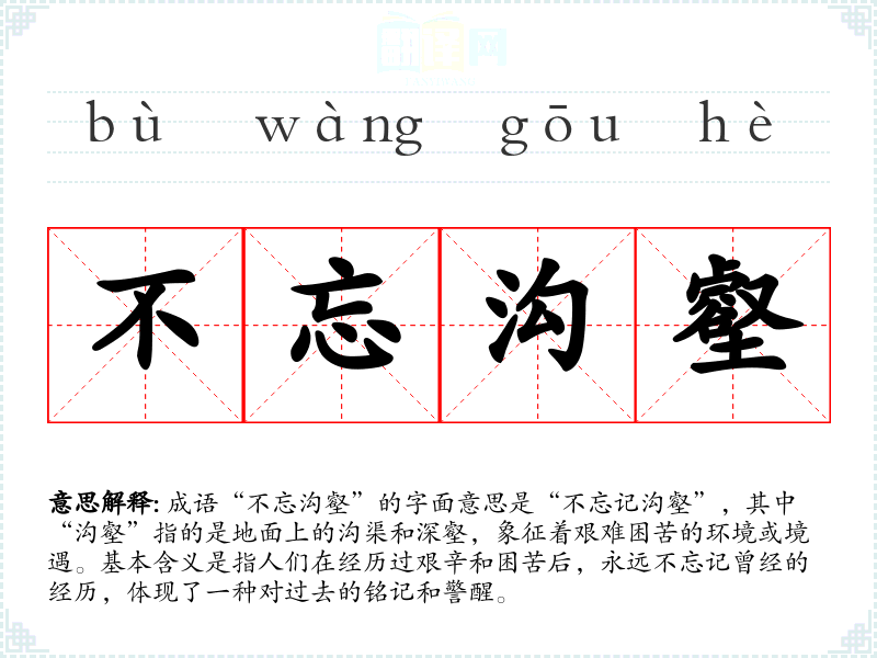 成语“不忘沟壑”的字面意思是“不忘记沟壑”,其中“沟壑”指的是地面上的沟渠和深壑,象征着艰难困苦的环境或境遇。基本含义是指人们在经历过艰辛和困苦后,永远不忘记曾经的经历,体现了一种对过去的铭记和警醒。