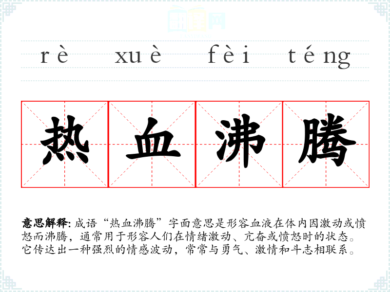 成语“热血沸腾”字面意思是形容血液在体内因激动或愤怒而沸腾,通常用于形容人们在情绪激动、亢奋或愤怒时的状态。它传达出一种强烈的情感波动,常常与勇气、激情和斗志相联系。