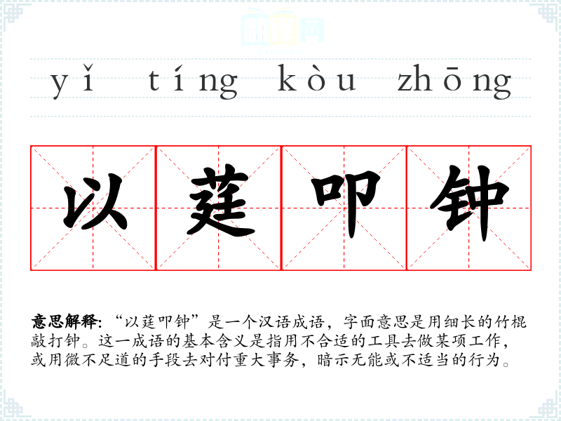 “以莛叩钟”是一个汉语成语,字面意思是用细长的竹棍敲打钟。这一成语的基本含义是指用不合适的工具去做某项工作,或用微不足道的手段去对付重大事务,暗示无能或不适当的行为。