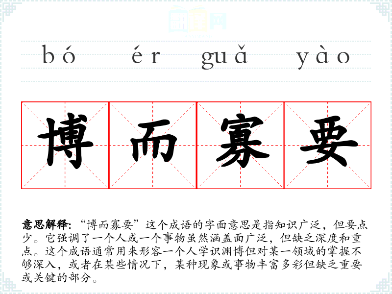 “博而寡要”这个成语的字面意思是指知识广泛,但要点少。它强调了一个人或一个事物虽然涵盖面广泛,但缺乏深度和重点。这个成语通常用来形容一个人学识渊博但对某一领域的掌握不够深入,或者在某些情况下,某种现象或事物丰富多彩但缺乏重要或关键的部分。