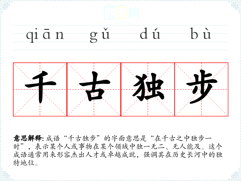 成语“千古独步”的字面意思是“在千古之中独步一时”,表示某个人或事物在某个领域中独一无二、无人能及。这个成语通常用来形容杰出人才或卓越成就,强调其在历史长河中的独特地位。