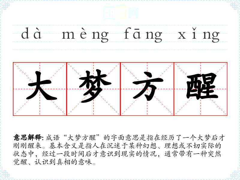 成语“大梦方醒”的字面意思是指在经历了一个大梦后才刚刚醒来。基本含义是指人在沉迷于某种幻想、理想或不切实际的状态中,经过一段时间后才意识到现实的情况,通常带有一种突然觉醒、认识到真相的意味。
