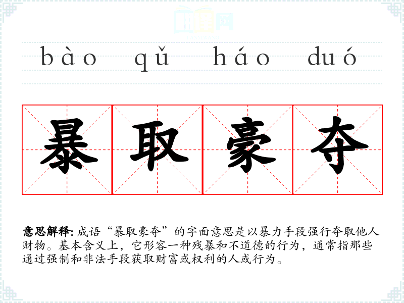成语“暴取豪夺”的字面意思是以暴力手段强行夺取他人财物。基本含义上,它形容一种残暴和不道德的行为,通常指那些通过强制和非法手段获取财富或权利的人或行为。