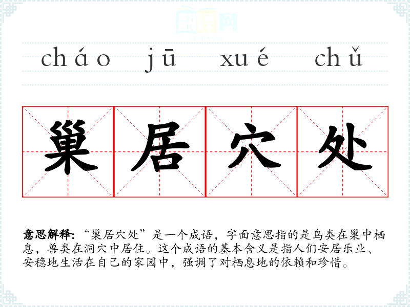 “巢居穴处”是一个成语,字面意思指的是鸟类在巢中栖息,兽类在洞穴中居住。这个成语的基本含义是指人们安居乐业、安稳地生活在自己的家园中,强调了对栖息地的依赖和珍惜。