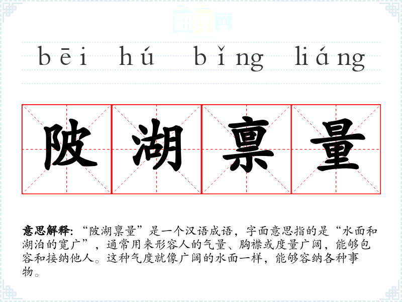 “陂湖禀量”并没有明确的历史出处或典故。它的构成部分“陂”和“湖”都与水有关,象征着宽广和包容。类似的成语如“海纳百川”等,常常用来描述人的胸怀和气度,因此可以推测其来源于古代对自然景观的观察和对人性格的描绘。