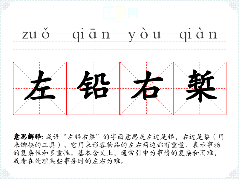 成语“左铅右椠”的字面意思是左边是铅,右边是椠(用来铆接的工具)。它用来形容物品的左右两边都有重量,表示事物的复杂性和多重性。基本含义上,通常引申为事情的复杂和困难,或者在处理某些事务时的左右为难。