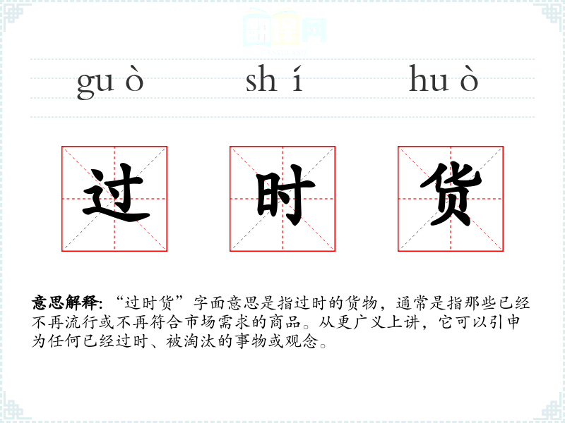 “过时货”并不是一个传统的成语,而是一个现代汉语词汇。这个词语反映了商业活动中的一种现象,随着时代的发展,某些商品或观念会逐渐失去其市场价值。在市场经济日益繁荣的背景下,“过时货”成为了一个常用的表达。