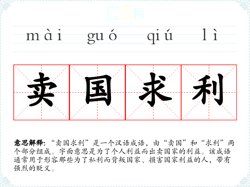 “卖国求利”是一个汉语成语,由“卖国”和“求利”两个部分组成。字面意思是为了个人利益而出卖国家的利益。该成语通常用于形容那些为了私利而背叛国家、损害国家利益的人,带有强烈的贬义。