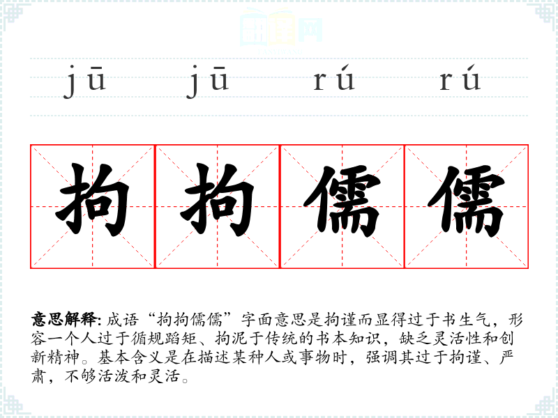 成语“拘拘儒儒”字面意思是拘谨而显得过于书生气,形容一个人过于循规蹈矩、拘泥于传统的书本知识,缺乏灵活性和创新精神。基本含义是在描述某种人或事物时,强调其过于拘谨、严肃,不够活泼和灵活。