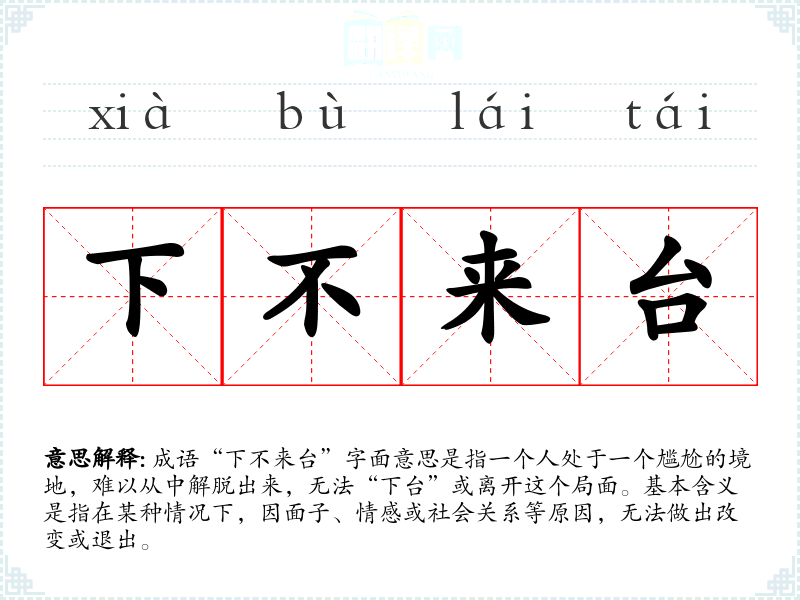 成语“下不来台”字面意思是指一个人处于一个尴尬的境地,难以从中解脱出来,无法“下台”或离开这个局面。基本含义是指在某种情况下,因面子、情感或社会关系等原因,无法做出改变或退出。
