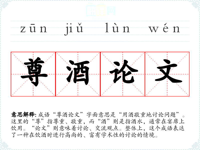 成语“尊酒论文”字面意思是“用酒敬重地讨论问题”。这里的“尊”指尊重、敬重,而“酒”则是指酒水,通常在宴席上饮用。“论文”则意味着讨论、交流观点。整体上,这个成语表达了一种在饮酒时进行高尚的、富有学术性的讨论的情境。