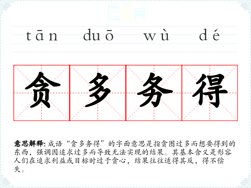 成语“贪多务得”的字面意思是指贪图过多而想要得到的东西,强调因追求过多而导致无法实现的结果。其基本含义是形容人们在追求利益或目标时过于贪心,结果往往适得其反,得不偿失。