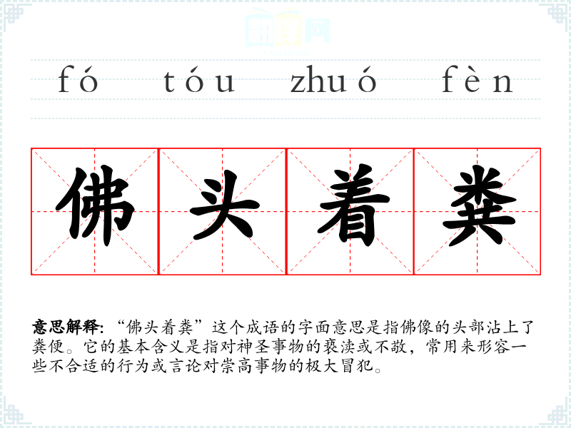 “佛头着粪”这个成语的字面意思是指佛像的头部沾上了粪便。它的基本含义是指对神圣事物的亵渎或不敬,常用来形容一些不合适的行为或言论对崇高事物的极大冒犯。