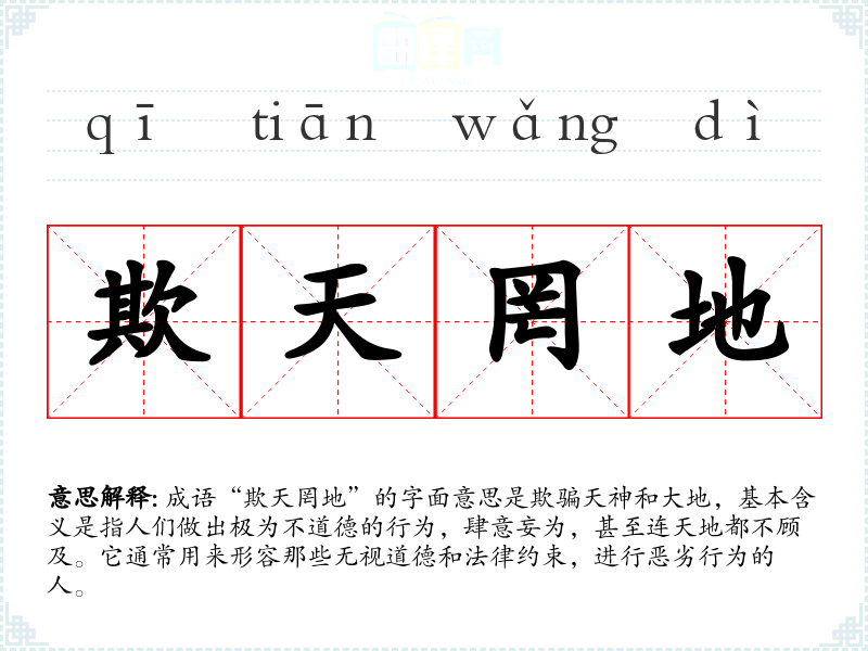 成语“欺天罔地”的字面意思是欺骗天神和大地,基本含义是指人们做出极为不道德的行为,肆意妄为,甚至连天地都不顾及。它通常用来形容那些无视道德和法律约束,进行恶劣行为的人。