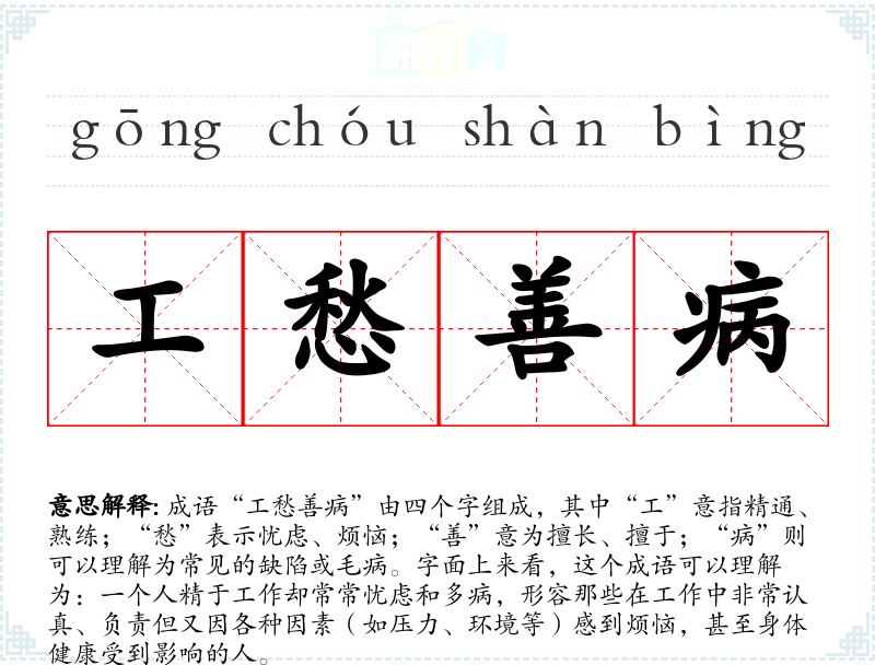成语“工愁善病”由四个字组成,其中“工”意指精通、熟练;“愁”表示忧虑、烦恼;“善”意为擅长、擅于;“病”则可以理解为常见的缺陷或毛病。字面上来看,这个成语可以理解为:一个人精于工作却常常忧虑和多病,形容那些在工作中非常认真、负责但又因各种因素(如压力、环境等)感到烦恼,甚至身体健康受到影响的人。