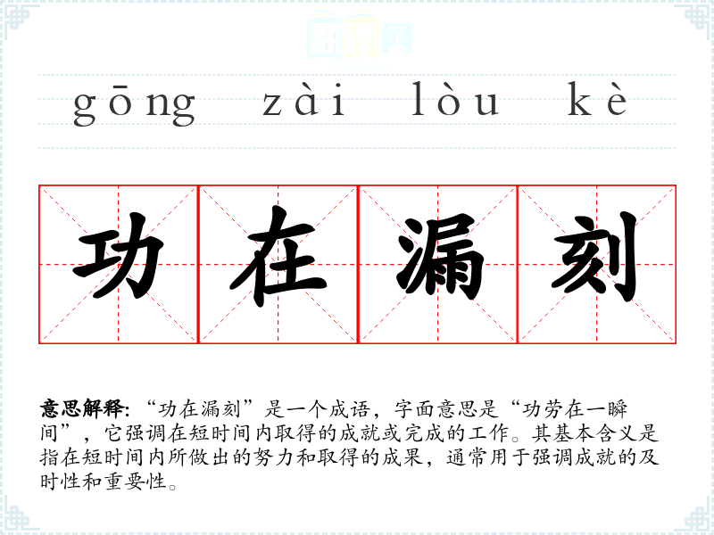 “功在漏刻”是一个成语,字面意思是“功劳在一瞬间”,它强调在短时间内取得的成就或完成的工作。其基本含义是指在短时间内所做出的努力和取得的成果,通常用于强调成就的及时性和重要性。