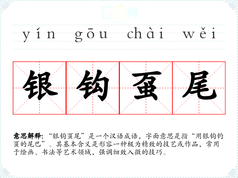 “银钩虿尾”是一个汉语成语,字面意思是指“用银钩钓虿的尾巴”。其基本含义是形容一种极为精致的技艺或作品,常用于绘画、书法等艺术领域,强调细致入微的技巧。