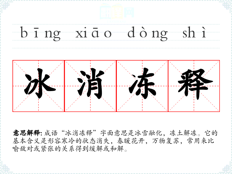 成语“冰消冻释”字面意思是冰雪融化,冻土解冻。它的基本含义是形容寒冷的状态消失,春暖花开,万物复苏,常用来比喻敌对或紧张的关系得到缓解或和解。