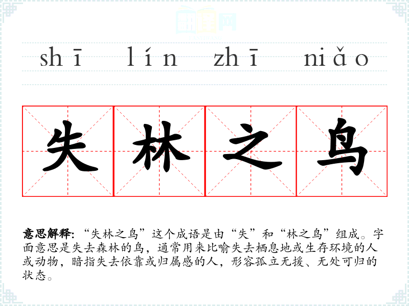 “失林之鸟”这个成语是由“失”和“林之鸟”组成。字面意思是失去森林的鸟,通常用来比喻失去栖息地或生存环境的人或动物,暗指失去依靠或归属感的人,形容孤立无援、无处可归的状态。