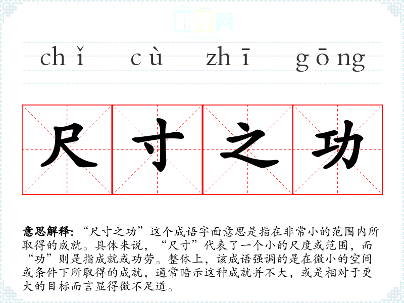 “尺寸之功”并没有明确的历史典故或文学出处,但其构造可以追溯到古代汉语中对“尺寸”这一概念的使用。古代文人常常用“尺寸”来形容事物的大小和界限,因此这个成语也可以理解为强调在某种局限性中的努力或成就。