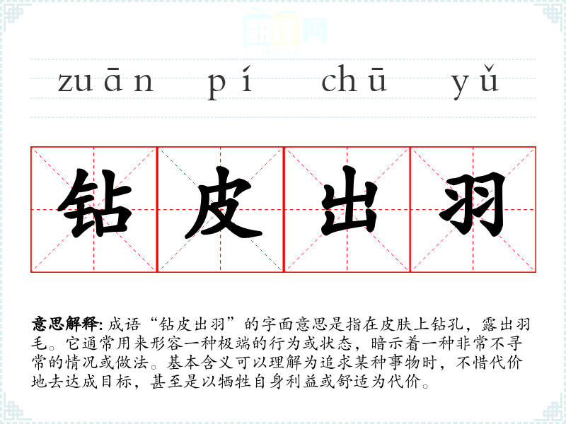 成语“钻皮出羽”的字面意思是指在皮肤上钻孔,露出羽毛。它通常用来形容一种极端的行为或状态,暗示着一种非常不寻常的情况或做法。基本含义可以理解为追求某种事物时,不惜代价地去达成目标,甚至是以牺牲自身利益或舒适为代价。