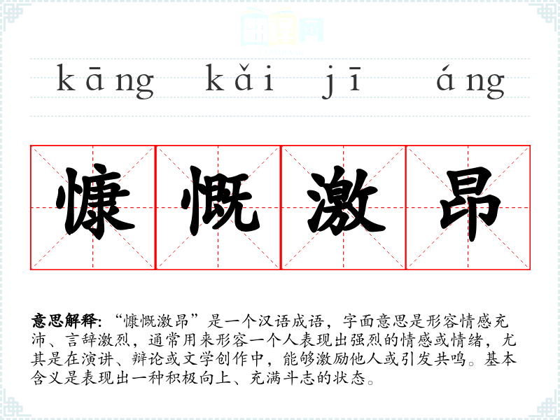 “慷慨激昂”是一个汉语成语,字面意思是形容情感充沛、言辞激烈,通常用来形容一个人表现出强烈的情感或情绪,尤其是在演讲、辩论或文学创作中,能够激励他人或引发共鸣。基本含义是表现出一种积极向上、充满斗志的状态。