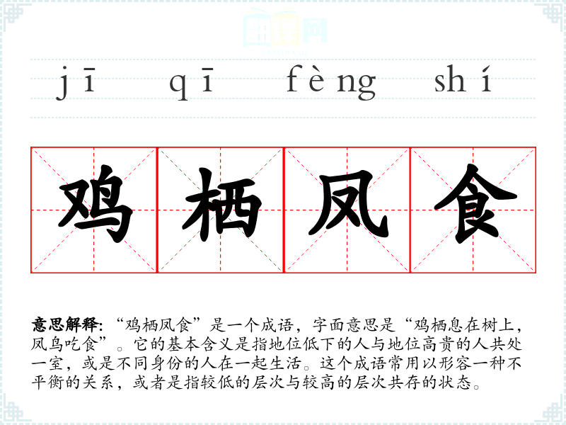 “鸡栖凤食”是一个成语,字面意思是“鸡栖息在树上,凤鸟吃食”。它的基本含义是指地位低下的人与地位高贵的人共处一室,或是不同身份的人在一起生活。这个成语常用以形容一种不平衡的关系,或者是指较低的层次与较高的层次共存的状态。