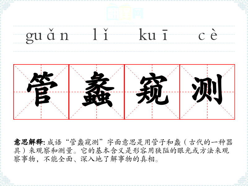 成语“管蠡窥测”字面意思是用管子和蠡(古代的一种器具)来观察和测量。它的基本含义是形容用狭隘的眼光或方法来观察事物,不能全面、深入地了解事物的真相。