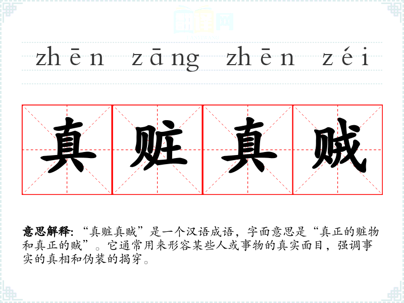 “真赃真贼”是一个汉语成语,字面意思是“真正的赃物和真正的贼”。它通常用来形容某些人或事物的真实面目,强调事实的真相和伪装的揭穿。