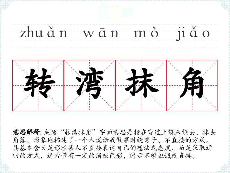 成语“转湾抹角”字面意思是指在弯道上绕来绕去,抹去角落,形象地描述了一个人说话或做事时绕弯子、不直接的方式。其基本含义是形容某人不直接表达自己的想法或态度,而是采取迂回的方式,通常带有一定的消极色彩,暗示不够坦诚或直接。