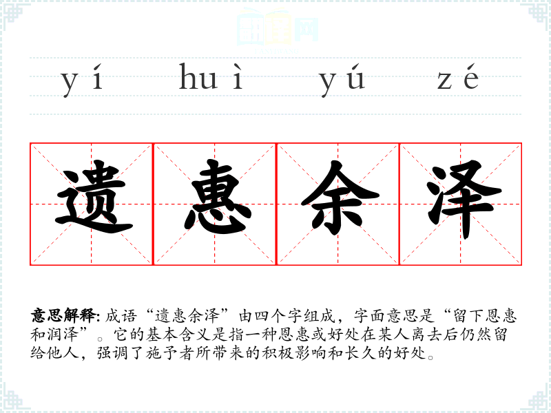 成语“遗惠余泽”由四个字组成,字面意思是“留下恩惠和润泽”。它的基本含义是指一种恩惠或好处在某人离去后仍然留给他人,强调了施予者所带来的积极影响和长久的好处。