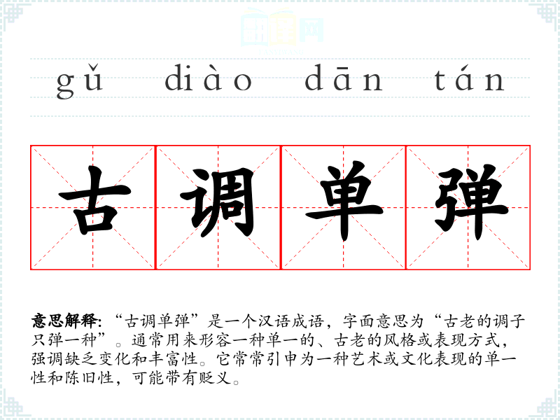 “古调单弹”是一个汉语成语,字面意思为“古老的调子只弹一种”。通常用来形容一种单一的、古老的风格或表现方式,强调缺乏变化和丰富性。它常常引申为一种艺术或文化表现的单一性和陈旧性,可能带有贬义。