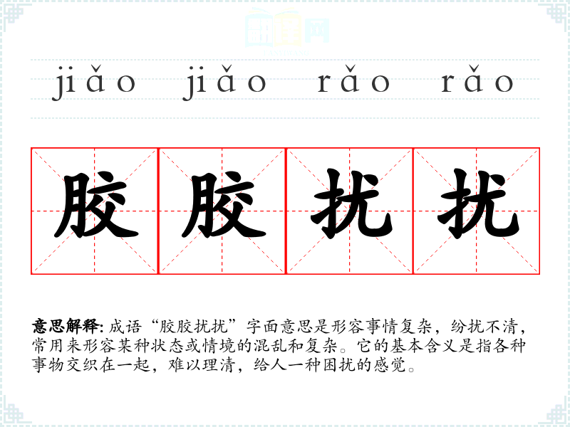 成语“胶胶扰扰”字面意思是形容事情复杂,纷扰不清,常用来形容某种状态或情境的混乱和复杂。它的基本含义是指各种事物交织在一起,难以理清,给人一种困扰的感觉。