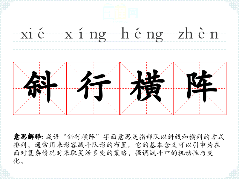 成语“斜行横阵”字面意思是指部队以斜线和横列的方式排列,通常用来形容战斗队形的布置。它的基本含义可以引申为在面对复杂情况时采取灵活多变的策略,强调战斗中的机动性与变化。