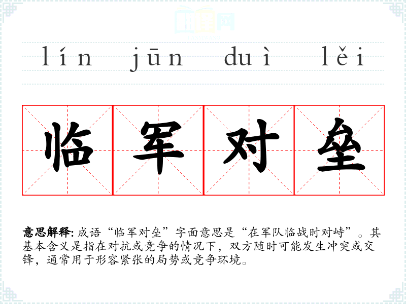 成语“临军对垒”字面意思是“在军队临战时对峙”。其基本含义是指在对抗或竞争的情况下,双方随时可能发生冲突或交锋,通常用于形容紧张的局势或竞争环境。
