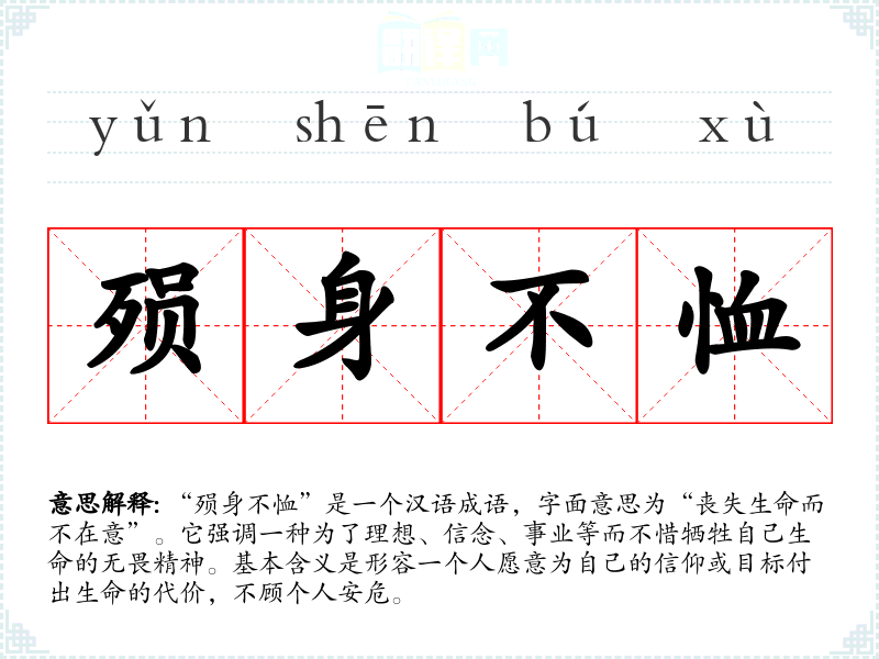 “殒身不恤”是一个汉语成语,字面意思为“丧失生命而不在意”。它强调一种为了理想、信念、事业等而不惜牺牲自己生命的无畏精神。基本含义是形容一个人愿意为自己的信仰或目标付出生命的代价,不顾个人安危。