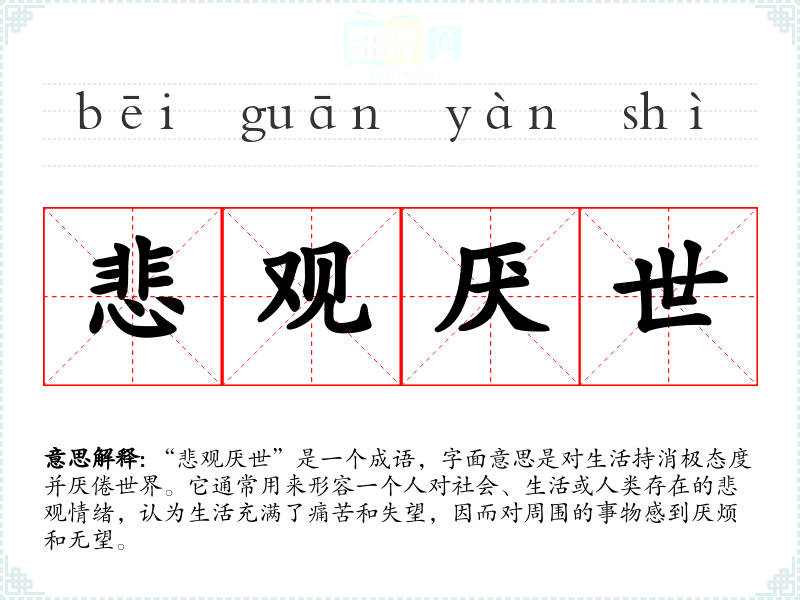 该成语并没有明确的历史典故或文学出处,但其构成的两个词“悲观”和“厌世”都是在**文化中常见的表现消极情绪的词汇。可以追溯到古代文人对生活的思考,尤其是道家和佛家的影响,强调对世俗的无常和痛苦的认识。