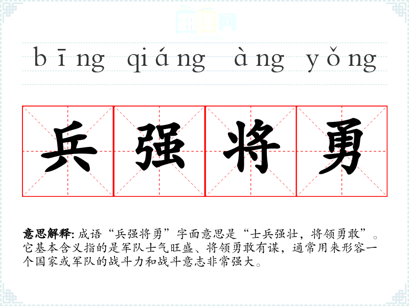 成语“兵强将勇”字面意思是“士兵强壮,将领勇敢”。它基本含义指的是军队士气旺盛、将领勇敢有谋,通常用来形容一个国家或军队的战斗力和战斗意志非常强大。