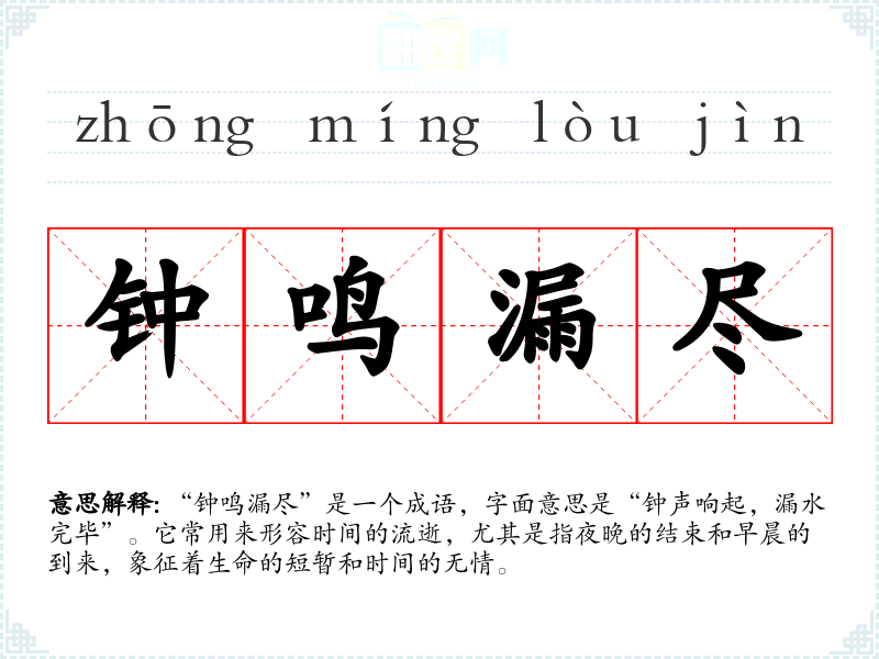 “钟鸣漏尽”是一个成语,字面意思是“钟声响起,漏水完毕”。它常用来形容时间的流逝,尤其是指夜晚的结束和早晨的到来,象征着生命的短暂和时间的无情。
